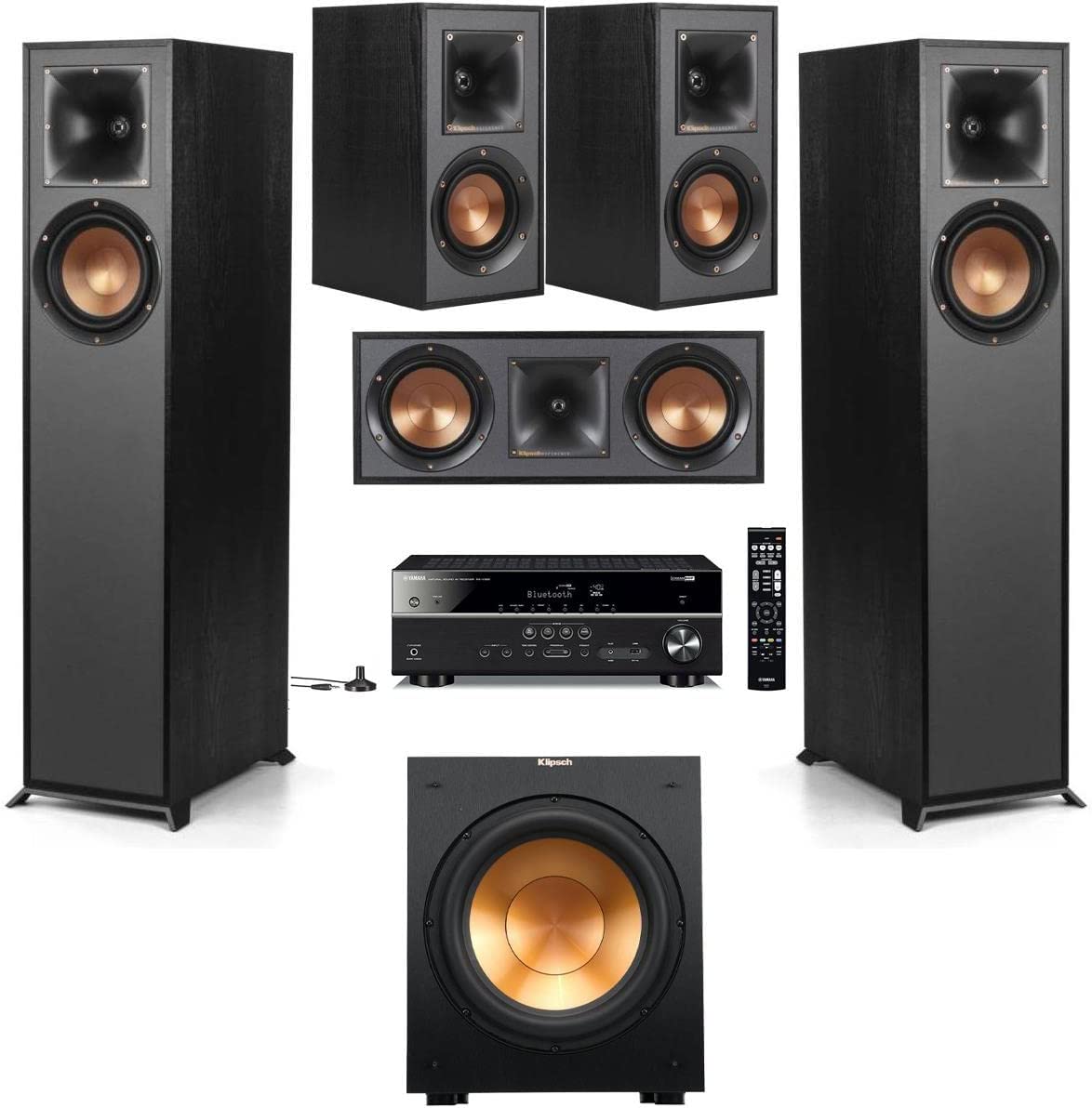 - 2x Klipsch Reference R-610F Floorstanding Home Speaker (Black Textured Wood Grain Vinyl) - Magnetic Grille - Injection-Molded Feet & Screws - Klipsch 5 Year Limited Warranty - Bundle With: - Reference R-52C Two-Way Center Channel Speaker (Black) - Reference R-12SW 12" 400W All-Digital Powered Subwoofer (Brushed Black Polymer Veneer) - 2x Reference R-41M Bookshelf Home Speakers (Black Textured Wood Grain Vinyl) - Yamaha RX-V385 5.1 Channel Network AV Receiver with Bluetooth... Read more