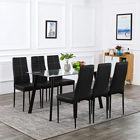 Tansole 7 Pieces Dining Table Set for 6, Dining Room Kitchen Table and Chairs for 6, Glass Dining Table and PU Leather Metal Frame Dining Chairs, Black