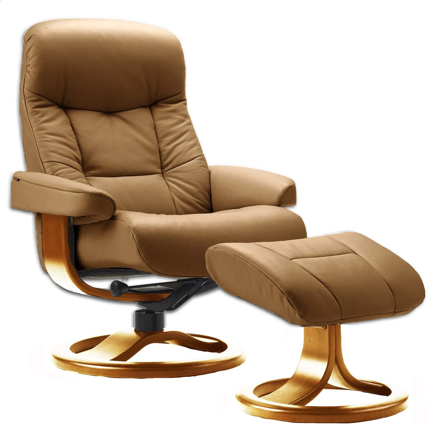 The Fjords Active Release System is featured on the legitimate Fjords leather Muldal Swivel Recliner and ottoman.