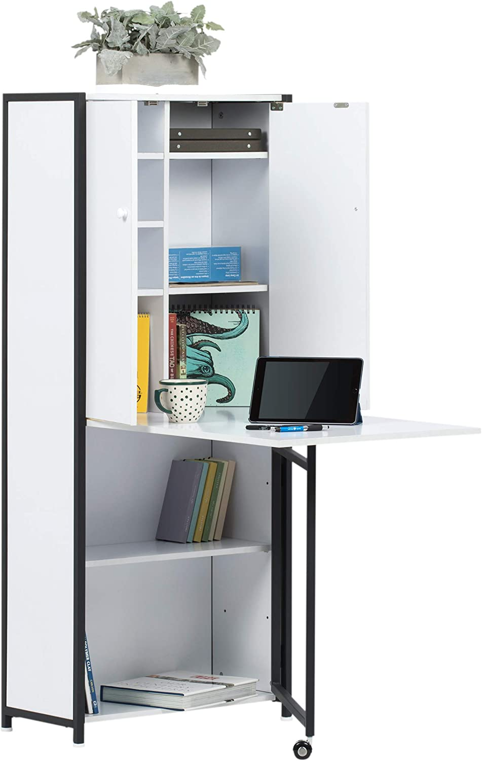 Studio Designs' Multi-Use hideaway desk armoire combines a table and storage for a tiny kitchen, office, or craft room area. The drop leaf top may store a tiny sewing machine, a laptop, or creative projects. Items may be readily hidden, keeping your workspace neat.