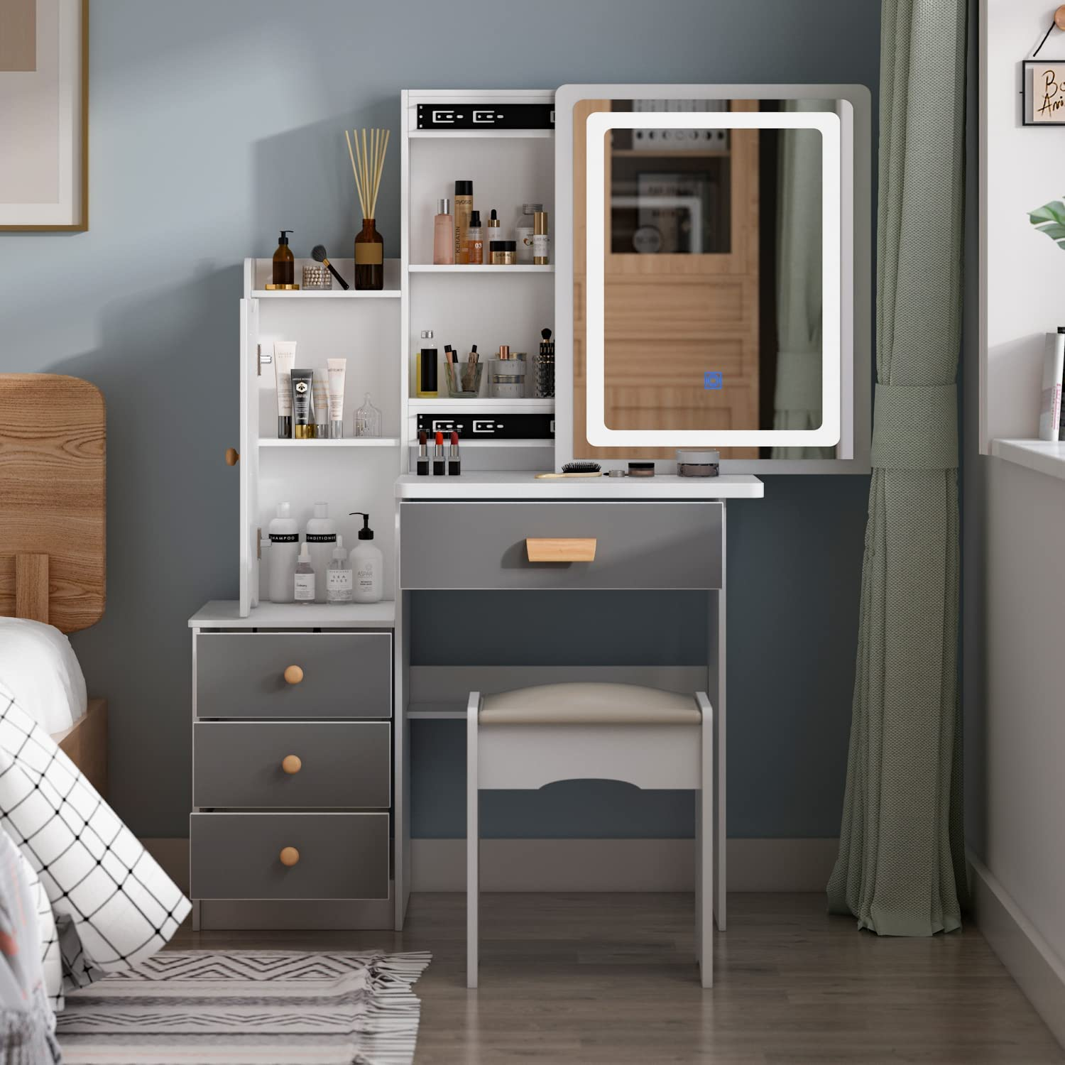 [Sliding Mirror & Hidden Storage Shelves]: The makeup dressing table features four drawers, one open shelf, two hidden shelves behind the door and two hidden shelves behind the sliding mirror. Read more