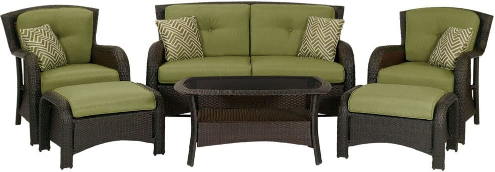 TOP MATERIAL OUTDOOR WICKER SOFAS: Hanover Strathmere 6-Piece Outdoor Patio Conversation Set, 2 Side Chairs with Ottomans, Loveseat and Tempered Glass Coffee Table, with Hand-Woven Wicker and Thick Cilantro Green Cushions, STRATHMERE6PC