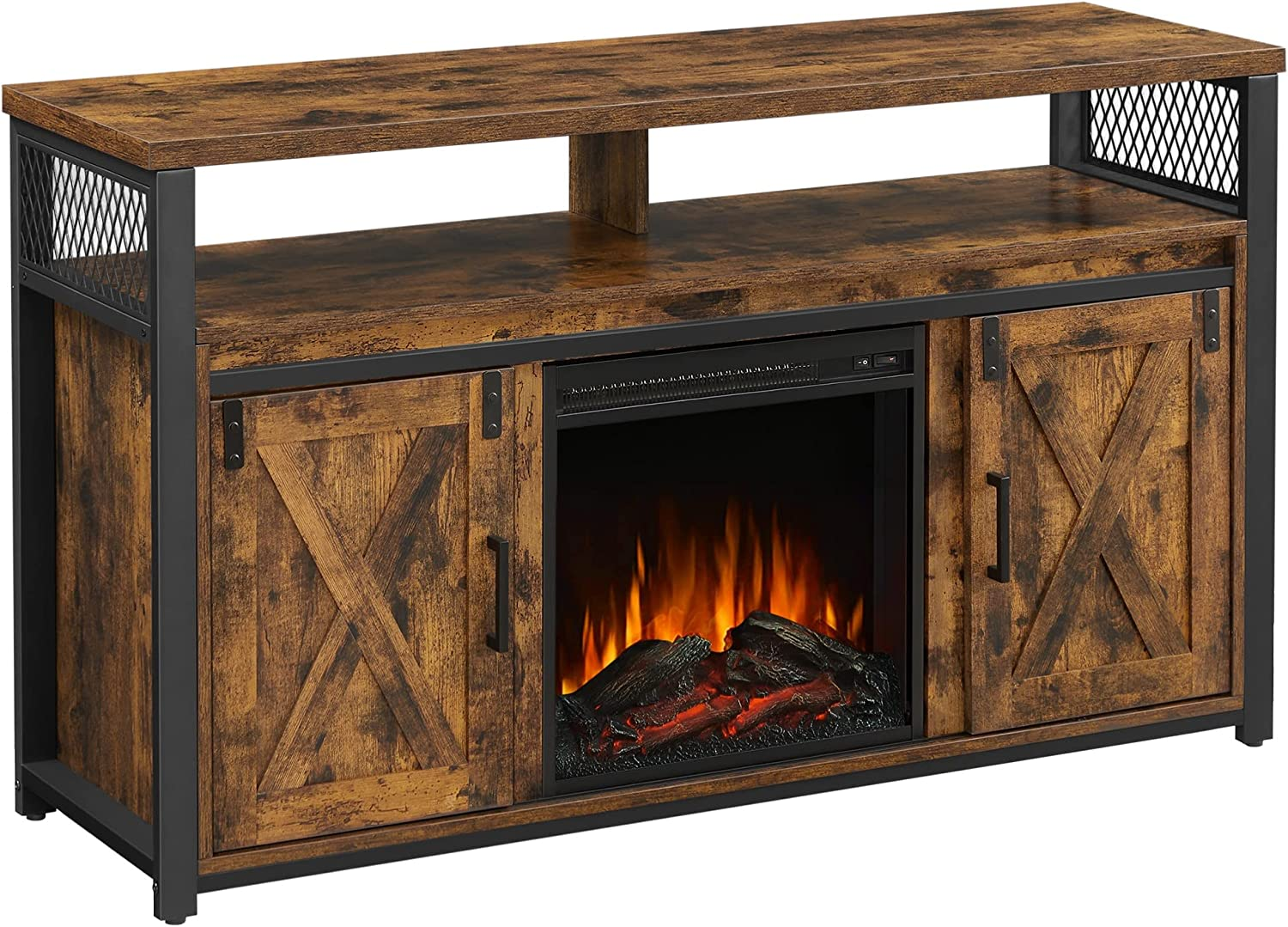 VASAGLE TV Cabinet with Fireplace, TV Stand for TVs up to 60 Inches, with Barn Doors, Adjustable Shelves, Industrial Style, Rustic Brown and Black ULTV053B01