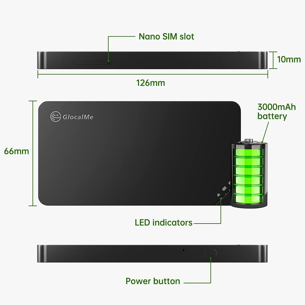 Travel wifi router is available on a pay-as-you-go basis. There are no contracts or roaming fees. Select the most appropriate data plan from our GlocalMe App at any moment. Includes 1.1GB of worldwide data and 8GB of US/CA/MX data. Please contact us to redeem the 8GB data by supplying the IMEI 2 number on the handset's back bottom.